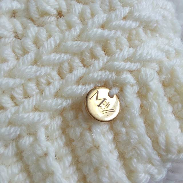 Matière : 100% laine mérinos / petit médaillon en acier inoxydable doré.